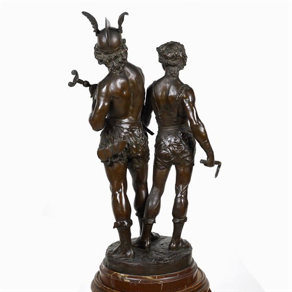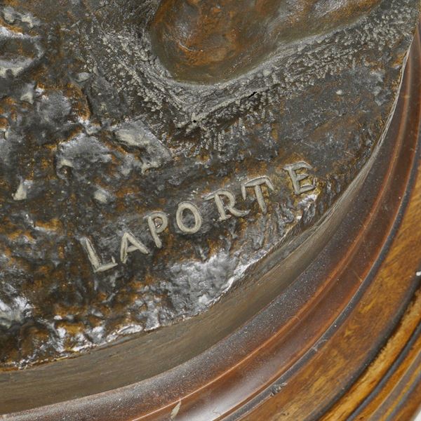 "Souviens-toi", burnished bronze sculpture with a circular base, signed on the base, complete with wooden pedestal, non coeval, h. 76 cm., h. 75,5 cm.