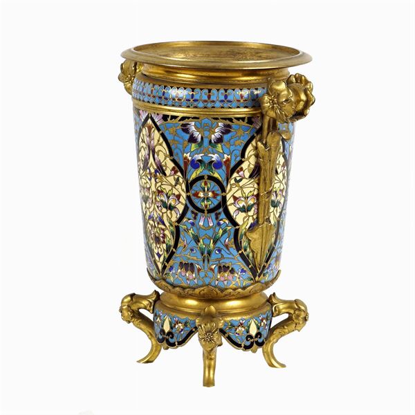 a pair of gilt bronze and enamel vases, resting on four volutes feet, body decorated with Blue, light blue, green, purple and yellow champlevè enamel, chiselled floral shoot handles, 25,5x22 cm.