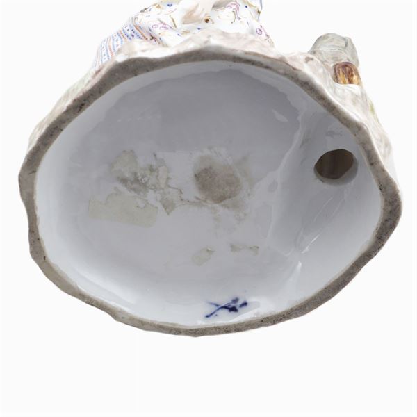 decorated in polychromy and partially gilt, one with a male figure and the other with a female figure, stem with floral and vegetals appliquèes, slight defects and losses, brand beneath the base, 28x24 cm.