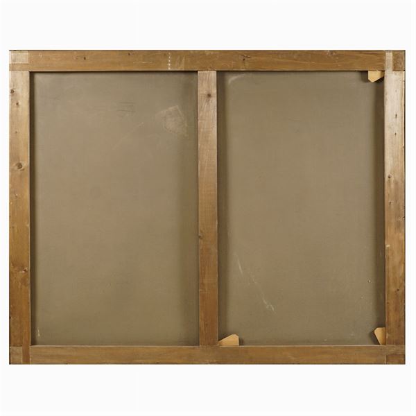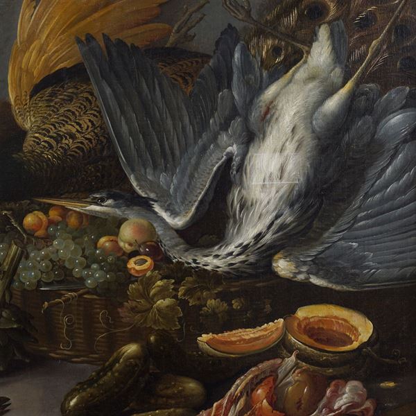 "Still life with wild game, fruits and vegetables", oil on canvas, within frame. The painting shows a restoration, 122,5x151 cm.