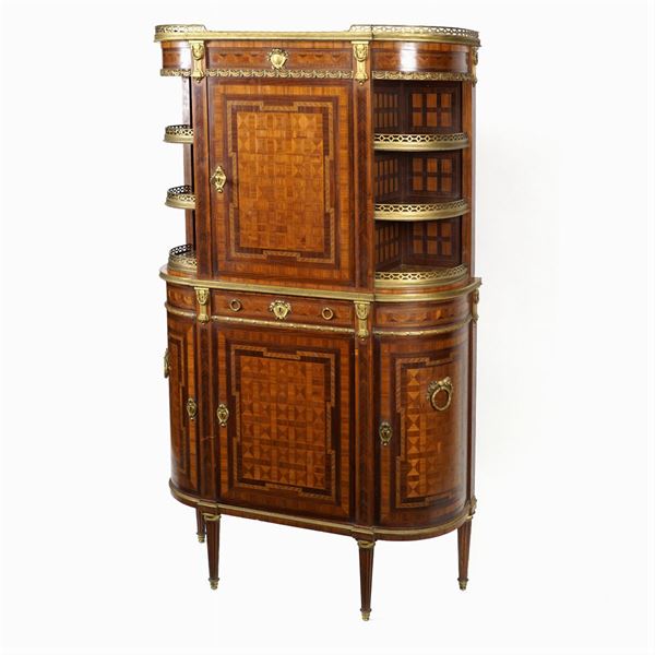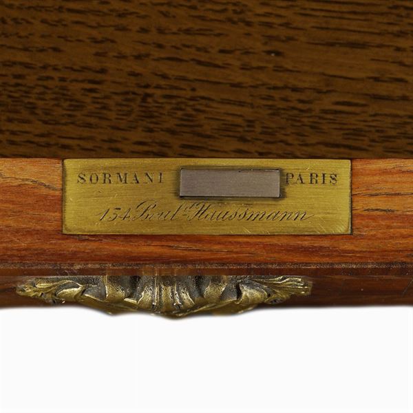 body inlaid with marqueterie, chiselled and gilt appliquèes, facade with doors and one drawer, spanish broccatello marble top and shelves, lock signed "Sormani Paris 134 rue Boul. Hausmann", 158x89x32 cm.