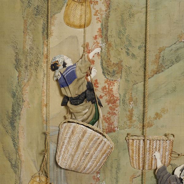 composed of six panels with fabric appliquèes depicting oriental life scenes, signed lower left, defects and wear, 182x370 cm.