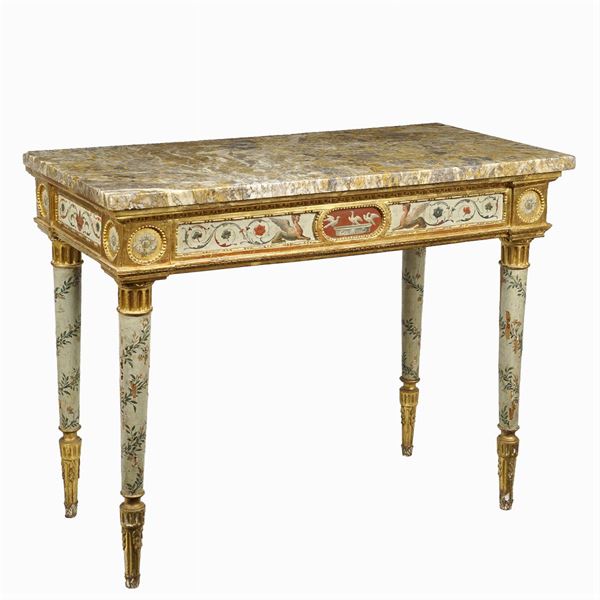 decorated in polychromy with vegetal and floral motives, rosette depicting doves in red background, rectangular marble top, slight defects to the varnish, marble with slight chipping, 97x118x59 cm.