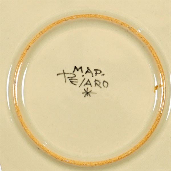 polychrome and black ceramic Decò tea set, decorated with female heads, composed by a teapot, milk jug, 12 cups with saucers, 12 sweet plates and a bowl, marked beneath the bases "M.AP. Pesaro", h. teiera 18 cm.