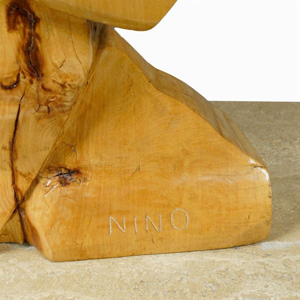 "Speranza", scultura in legno di faggio, firmata in basso a destra, base in travertino, 101,5x58x35 cm.