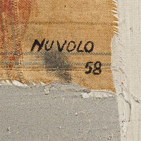 "Untitled", mixed technique, paiting and collage on canvas, 1958, signed at the center, within frame. Work registered in the Associazione Archivio Nuvolo Città di Castello (PG).