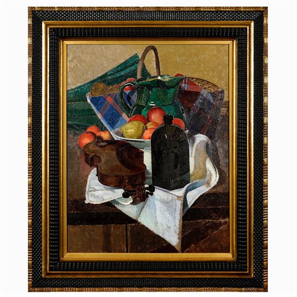"Natura morta con frutta, brocca e violino", 1928 circa, oil on canvas, signed lower left. Work registered at the Istituto Matteucci, Viareggio with the n. 415574, authentic on photograph fated 16/01/2015.