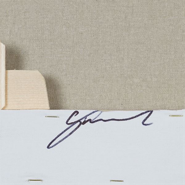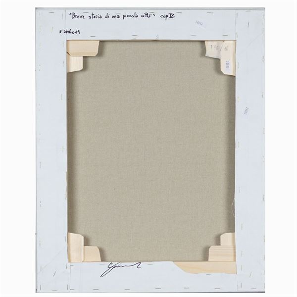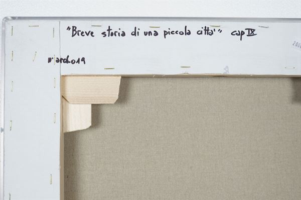 "Breve storia di una piccola città", 2019, paper boats on canvas, signed and titled on the reverse, within plexiglass box. Work registered in the Archivio Gusmaroli, under the number 019.jpeg as from certificate on photograph, 55x45 cm.