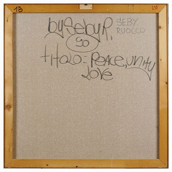 "Peace, Unity, Love", 1990, mixed technique, signed and dated lower left, signature, title and date on the reverse, within frame, 90x90 cm.