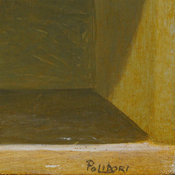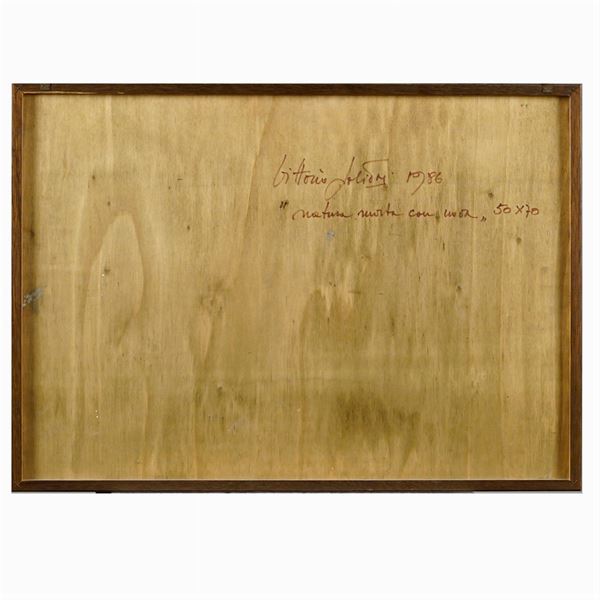 "Natura morta con uova", 1986, oil on panel, signed lower right, signature, date and title on the reverse, within frame, 51x71 cm.