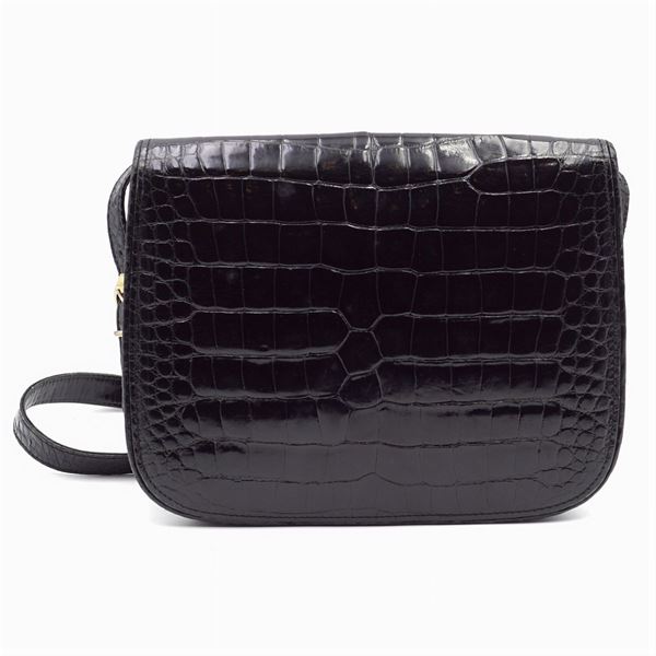 black color, adjustable shoulder handle, golden metal details, flap closure, interior with zip pocket.
