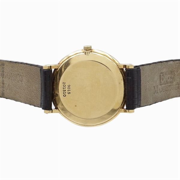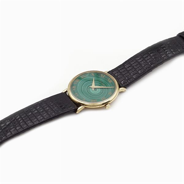 18 kt gold, oval case 27 mm. ref 9015/201510, malachite dial with roman numbers, mechanical movement with manual charging, leather strap with 18 kt golden metal buckle