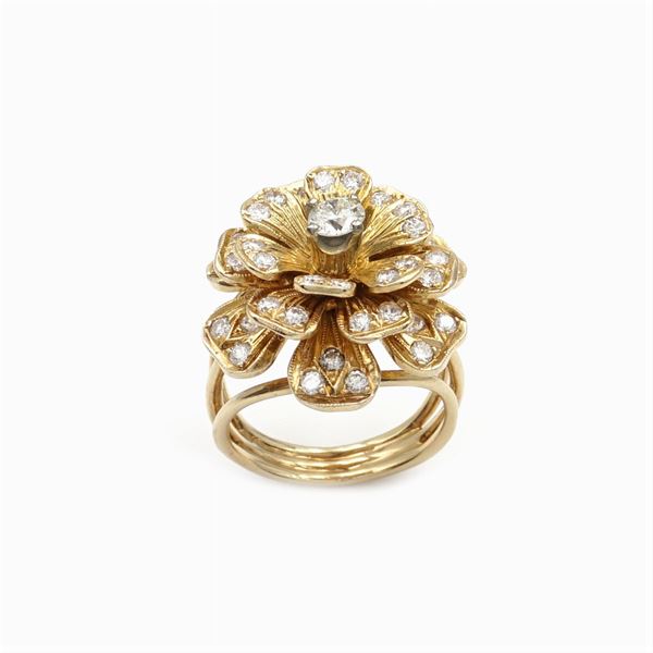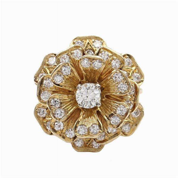 central diamond ct 0,40 ca surounded by brilliant cut diamonds ct 1,25 ca, size 12, peso 10,7 gr.