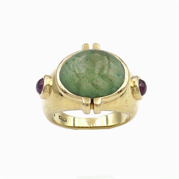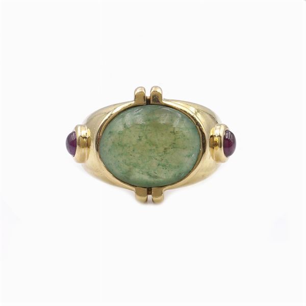 cabochon cut, on either side two cabochion cut rubies, size 13, peso 14,9 gr.