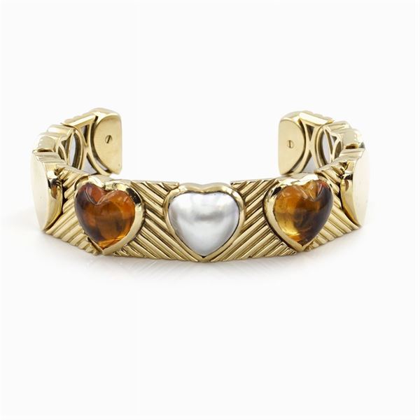 centered by three hearts with mabé pearl and heart cabochon cut citrines, diameter 6 cm., peso 51 gr.
