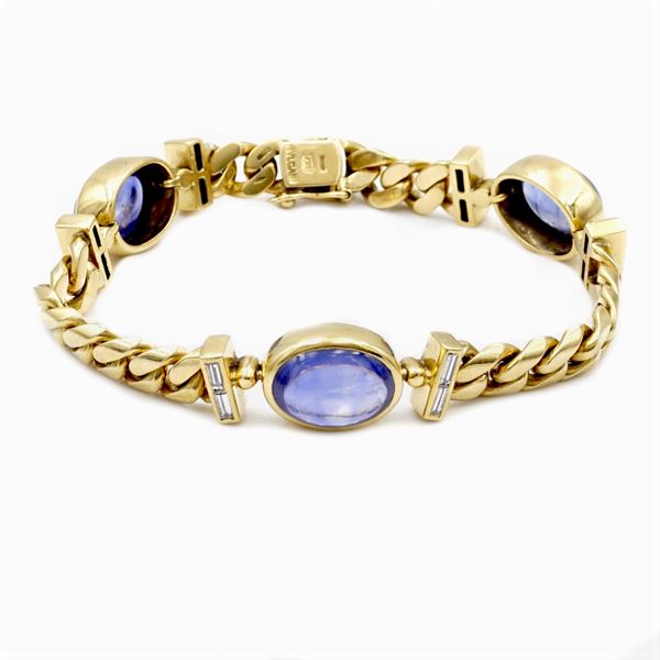 groumette links alternated by three sapihires cabochon cut ct 12 ca. and diamonds baguette cut ct 0,60 ca., hidden clasp, signed on the clasp. length 17 cm., peso 39,5 gr.