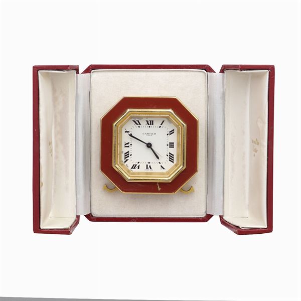 Decò line, golden brass and red-orange lacquer, ref. 7507-04894, white dial with roman numbers, defects, mechanical movement with manual winding.
