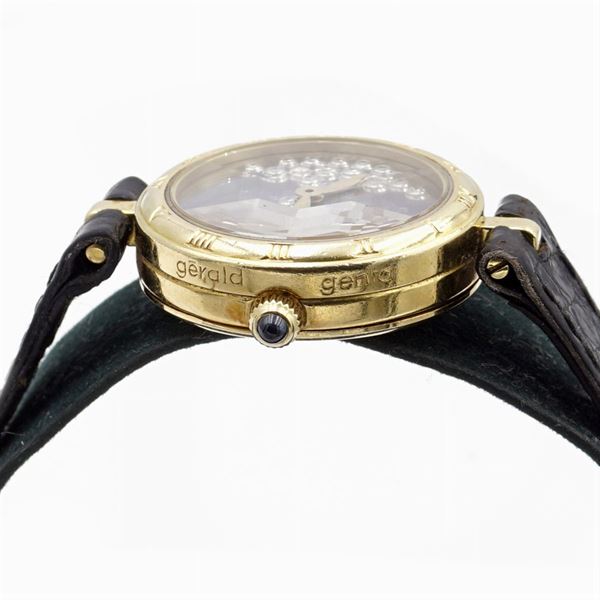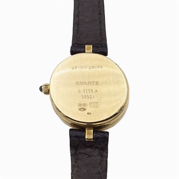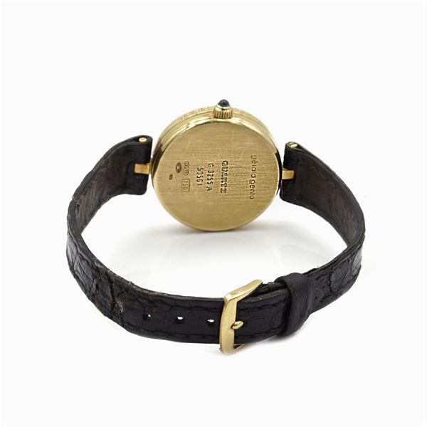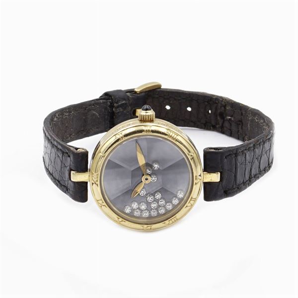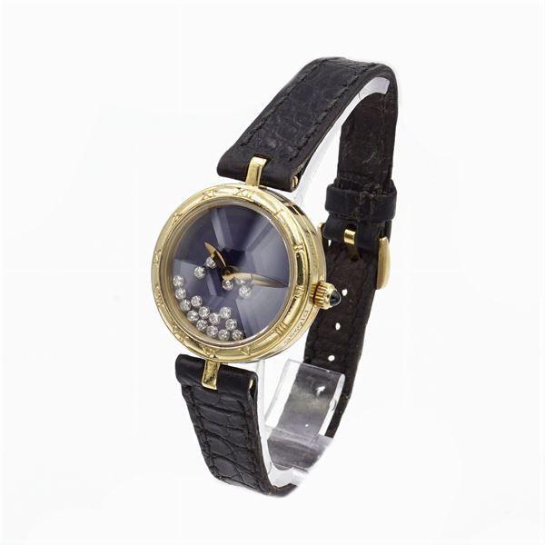yellow gold, round case 27 mm. - ref. G3255A - 50561, glazed dial with brillant cut diamonds, sapphire crystal, bezel with roman number inlaid, sapphire crown, quartz movement, eta 956412, leather strap with original 18kt gold clasp