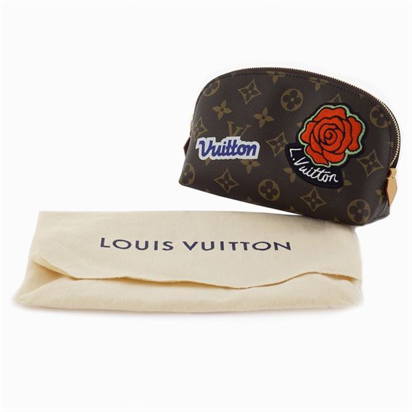 pochette made in monogram canvas, distinguished by LV Stories appliquèes, finishes in natural calf, golden matal details, zipped, completed by the original box, excellent condition, 19x12x6 cm.