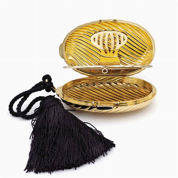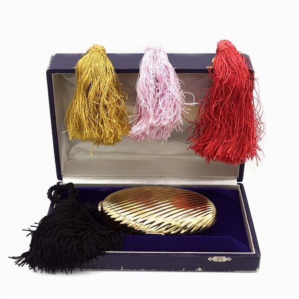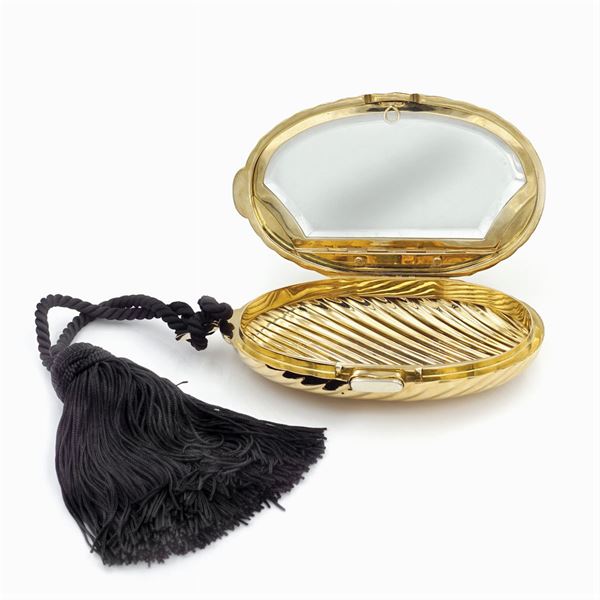 oval shape, with inside a mirror with a compartment and mony clip signed, completed by black cord. original box, 16,5x9 cm., peso 380 gr.