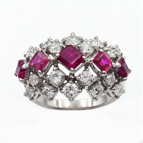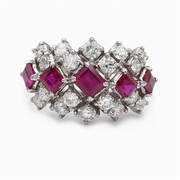 brilliant cut diamonds ct 1,50 ca and five carré cut rubies ct 2 ca, size 9, peso 8,5 gr.