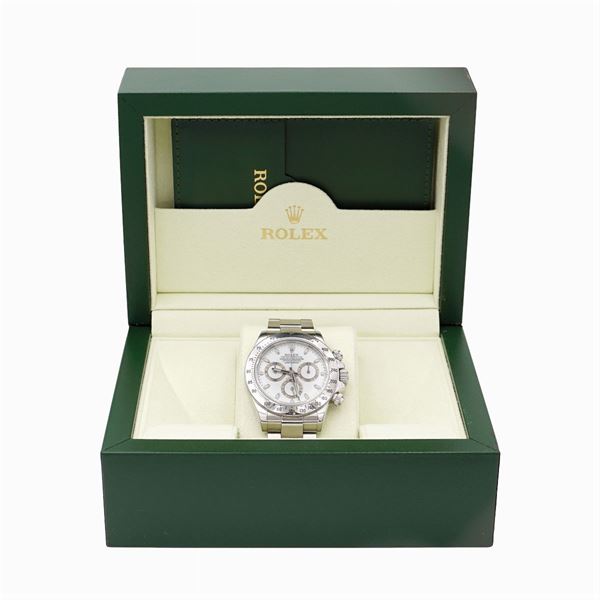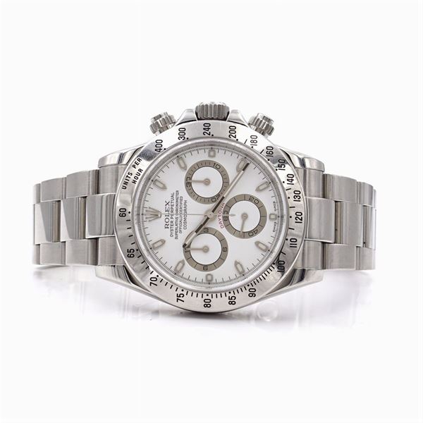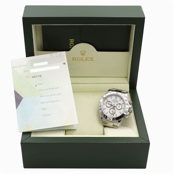 steel chronograph 44 mm. round case ref.116520 - D649281, white dial with indexes and three counters, bezel with tachometer scale, screw buttons, sapphire crystal, mechanical movement with automatic winding, 4130 caliber, original steel oyster fliplock strap.