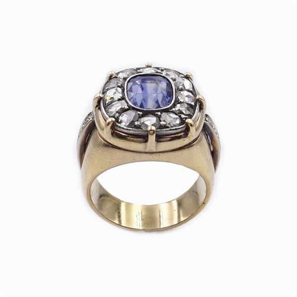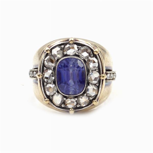 oval cut ct 1,50 ca. slight defects, sorrounded by diamond roses ct 0,90 c., on either side brilliant cut, size 11, peso 13,5 gr.