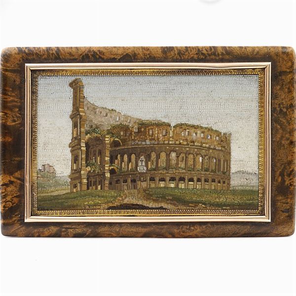 rectangular body, gold frame and closure, lid centered by a roman micromosaic plaque on copper, depicting a view of the Colosseum, probably work of Antonio Agutti (Rome, first half of 19th century)
