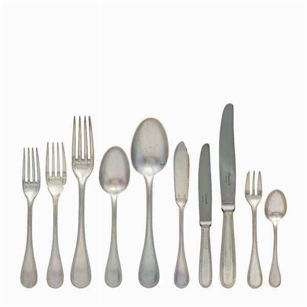 "Perles" model, composed of: 12 forks, 12 knives, 12 spoons, 12 fruit forks, 12 fruit knives, 12 medium spoons, 12 teaspoons, 12 desert forks, 12 fish forks, 12 fish knives