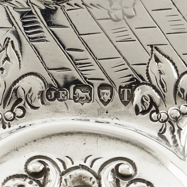 b) silver basket, London 1894, mark of Jesse Earls, shaped body, embossed and chiselle with vegetal, fruit and masks motives, resting on spherical feet, 4x21x16 cm., peso complessivo 409 gr.