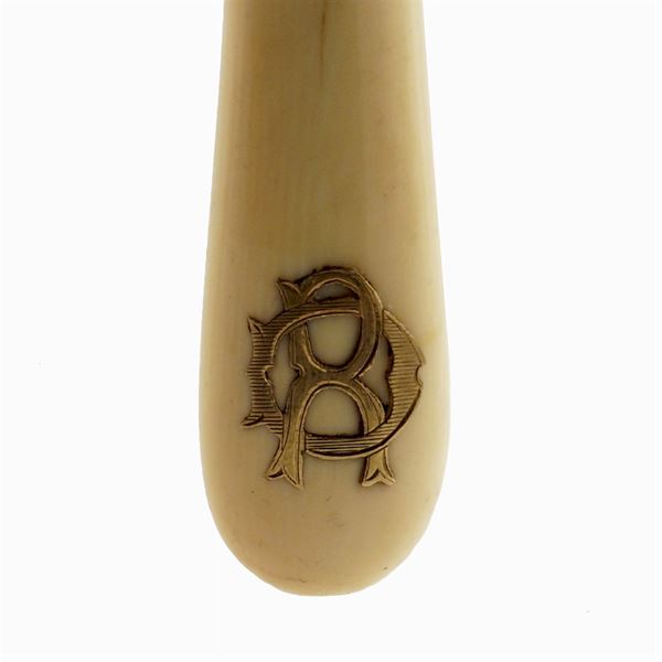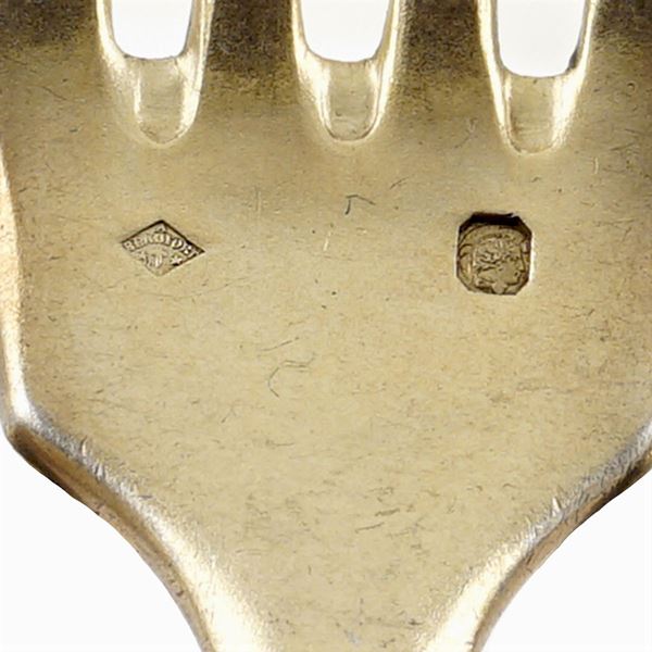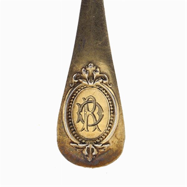 mark of Albert Beaufort, composed by: 12 forks, 12 spoonds, 12 knives with bone handle, smooth bodies, chiselled on the reverse with monogramm and vegetal motives, peso 1300 gr.