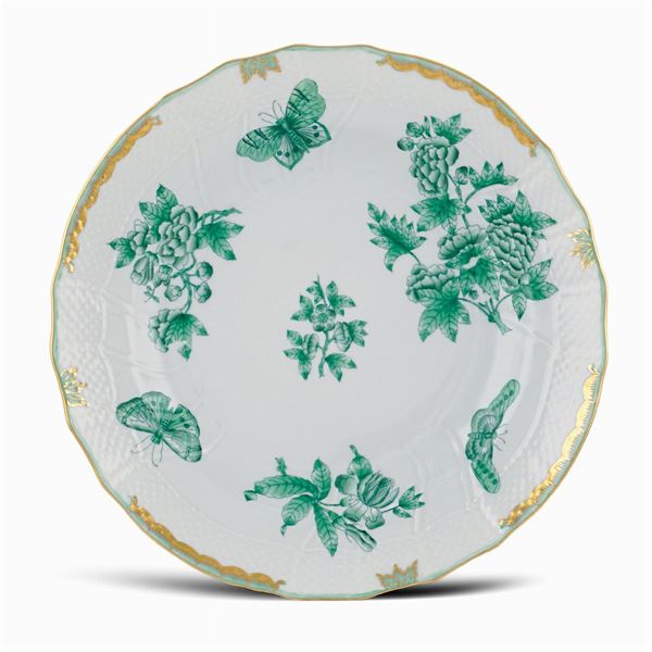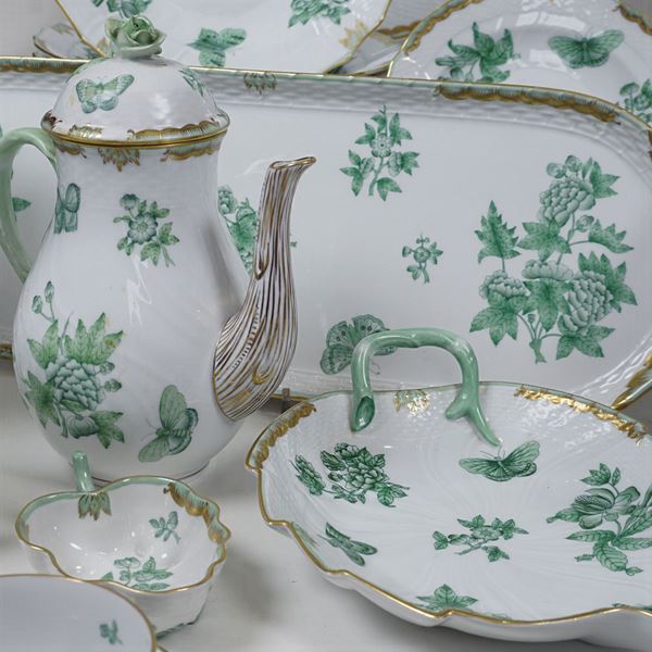 decore "Fortuna green " on white background and gilt profiled, marks under the base. Composed by: 25 flat plates, 12 soup plates, 25 fruit plates, 12 dessert plates, a soup bowl, a vegetable tureen, a saucer, an ashtray, 2 leaves, 3 oval serving dishes, 2 circular serving dishes, a circular tray, 2 oval traies, a salad bowl, a teacup, a warmer, 11 teacup with saucers, 2 coffee pot, 13 coffee cups with saucers, a sugar bowl, 2 milk jugs