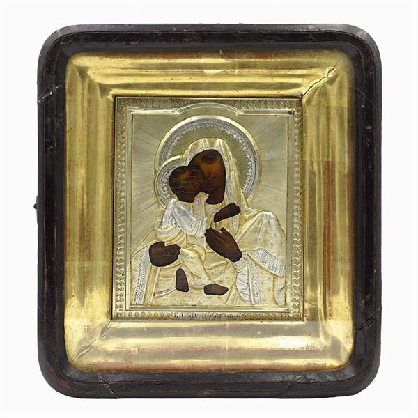 Icon depicting the Madonna Di Vkadimir with silver riza