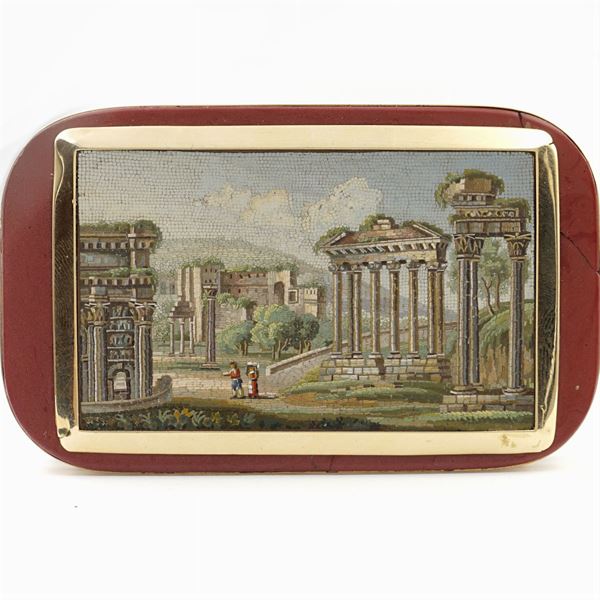 oval red lacquer and shell body (with defects), gold frame and closuer, lid centered by a roman micromosaic plaque on copper, depicting the "Foro romano", 2,8x8,7x5,5 cm.