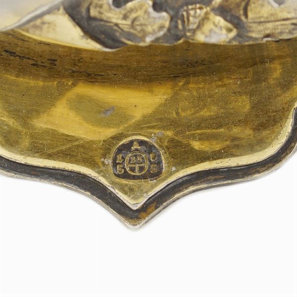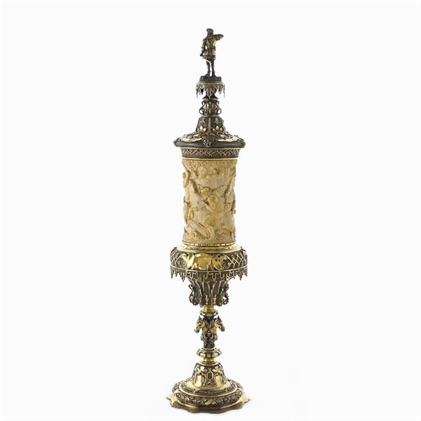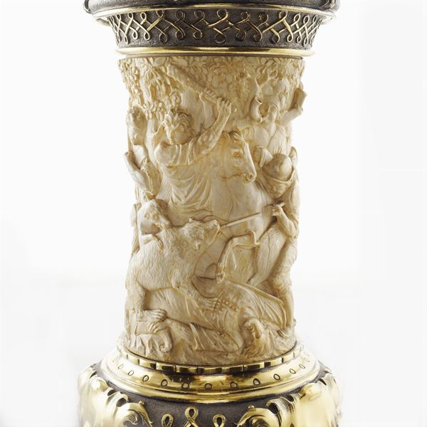 mounted on golden silver chiselled with vegetal and horse heads patterns, bone element depicting a hunt scene, h. 64 cm., peso complessivo 1978 gr.