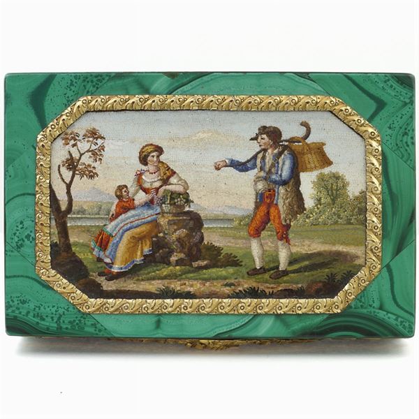 rectangular body, gold setting and closure, lid centered by a roman micromosaic plaque on copper, depicting "Scena di vita popolare", taken from the inlays of Bartolomeo Pinelli