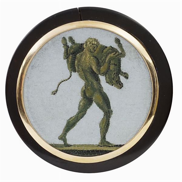 circular body, gold frame and closure, lid centered by a roman micromosaic plaque on copper depicting "Ercole con il leone di Nemea"