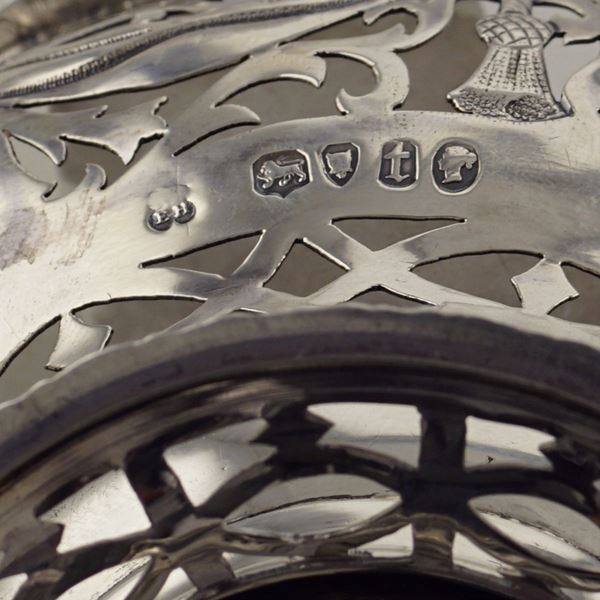 mark of Richard Martin & Ebenezer Hall, circular body pierced with greeks and geomtric motives, slight defects, 15x12 cm., peso 165 gr.