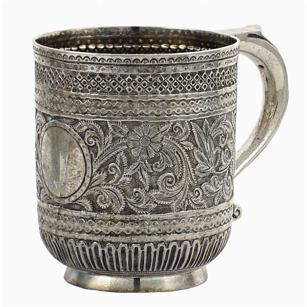 mark of Charles Stuart Harris, body embossed and chiselled with vegetal motives, shaped handle, h. 8,5 cm., peso 164 gr.