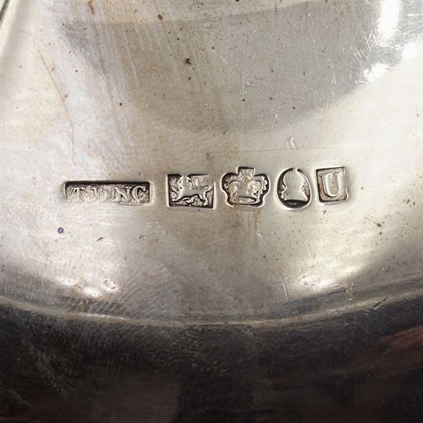marks Thomas, James e Nathaniel Creswick, oval body decorated with vegetal patterns, resting on four scroll shaped feet, 28x41x28 cm., peso 3692 gr.