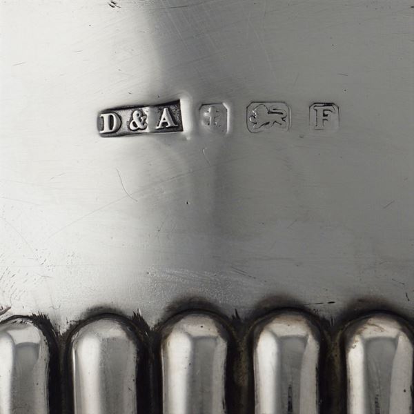 mark of Daniel & Arter, embossed, fluted and chiselled body with vegetal motives, shaped handle and wooden lid handle, h. 16 cm., peso 828 gr.