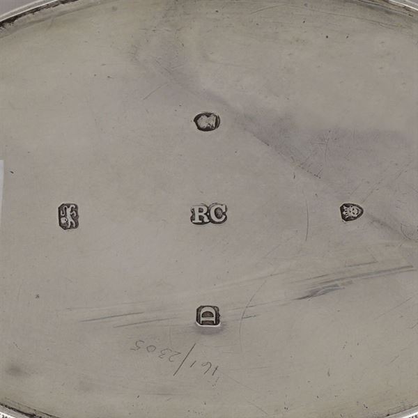 mark Richard Cook, plain body with heraldic crest, profiles chiselled with vegetal patterns, shaped wooden handle, h. 14 cm., peso 552 gr.