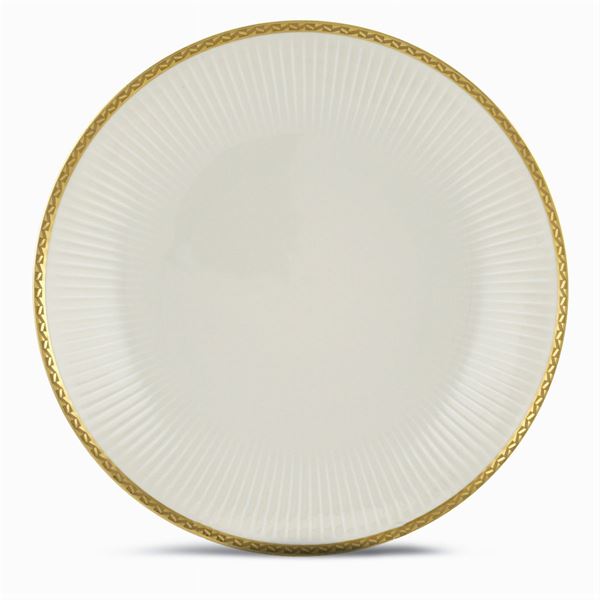 golden profiled, mark under the base, composed by 36 flat plates, 12 soup plates, 12 fruit plates, a soup tureen, 4 oval serving dishes, 2 salad bowls, 2 circular stands, 2 oval plates, a sauceboat, a coffee pot, a milkjug, a sugar bowl, 11 teacups with saucers
