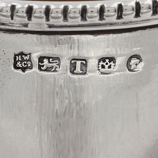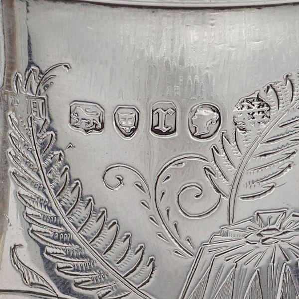 a) mark Robert Hennell IV, body inlaid with vegetal patterns, shaped handle, London 1872, h. 8,5 cm.