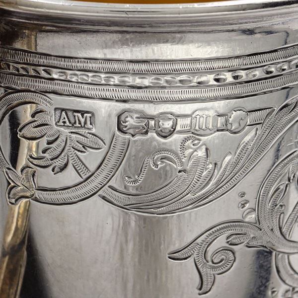 C) mark Alexander Macrae, body inlaid with vegetal patterns, scroll shaped handle, London 1867, h. 10,5 cm., peso complessivo 451 gr.