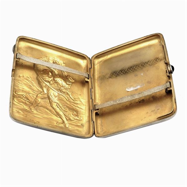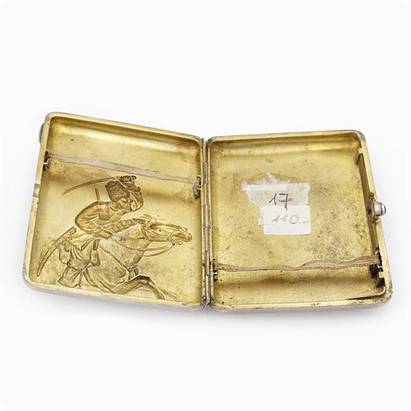 b) rectangular shape box, lid decorated with a warrior and felines, 11x8,5 cm., peso complessivo 385 gr.