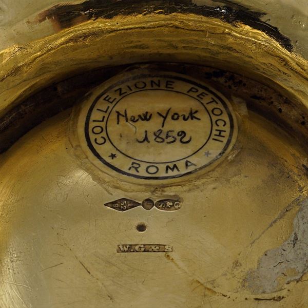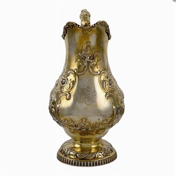 mark of William Gale & Son, body embossed and chiselled with floral and vegetal motives, handles with grapes shape, h. 27 cm., peso 718 gr.