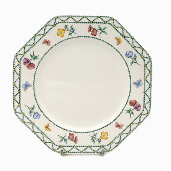 Composed of: 24 flat plates, 12 soup plates, 12 fruit plates, a soup tureen, 2 serving plates, a salad bowl, 2 hors d’oeuvre plates, 12 cups, 6 coffee cups with saucers, 6 tea cups with saucers, a coffee pot, a teapot, a sugar bowl, a milk jug