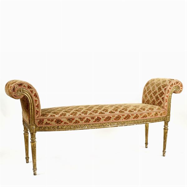 shaped structure, carved with floral and vegetal motives, seat and armrests upholstered and covered with fabric, defects, 70x150x38 cm.