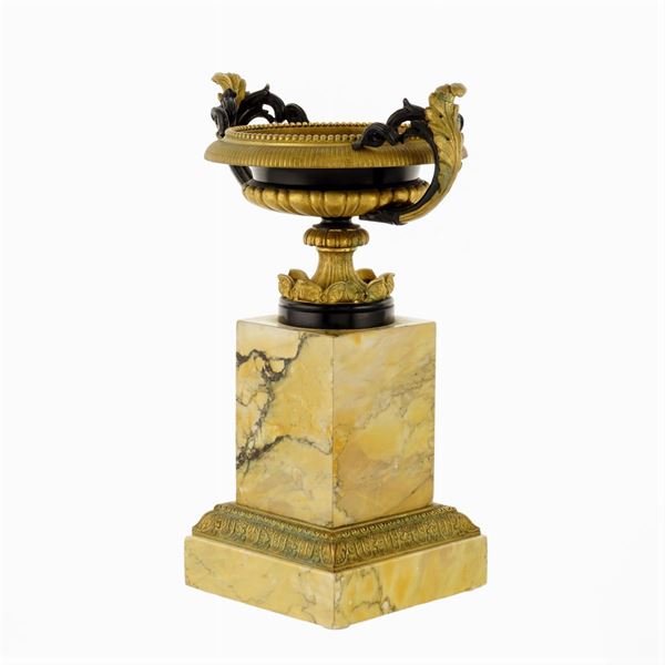 pair of gilded and black enamelled bronze cups, yellow Siena marble plinth bases, 32x13,5x13,5 cm.